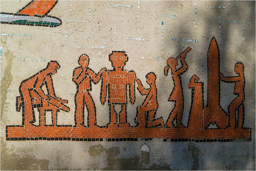 Неплохо сохранилась мозаика на здании Института развития образования. На ней пионеры, ракеты, планеты. Примерно такой же сюжет можно пока увидеть и на стене магазина «Умелые руки» на ул. Войкова. «Про лица вы уже всё давно поняли. Исключений нет даже для детей, - отмечает фотограф суровость персонажей. - Самый улыбчивый здесь робот». Человекоподобный, кстати, андроид.