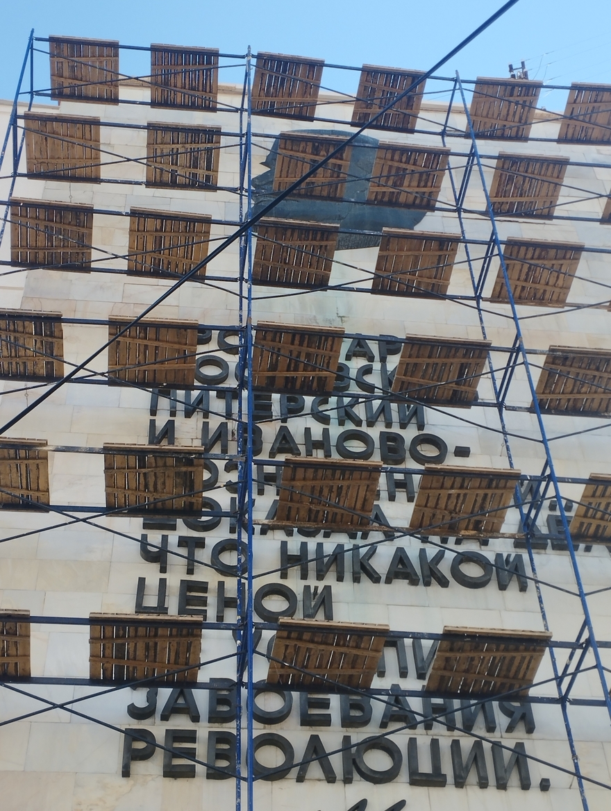 Продолжается реконструкция фасадов административного здания по адресу пл. Революции, 2/1. Четырехэтажный корпус, растянувшийся на 170 метров, построен в начале 1930-х для органов управления Ивановской промышленной областью.