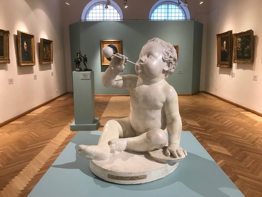 Экспозицию дополняют скульптуры, выполненные приблизительно в те же времена, что и живописные полотна. Пожалуй, самое необычное произведение – работа «Мальчик, выдувающий мыльные пузыри» Самуила Гальберга, значимого в ту эпоху скульптора. В Италии им были созданы две мраморные скульптуры, которые принесли ему известность, а позднее и звание профессора, – «Рождение музыки» и «Мальчик-пузырник» (так назвал композицию сам автор). В Ивановском музее экспонируется один из повторов, выполненный из гипса в мастерской Академии художеств. Многих удивляет тоненькая соломинка, через которую ребенок выдувает пузыри: неужели скульптор мог вырубить ее из мрамора – толщиной в несколько миллиметров? Да, смог. Правда, не во всех скульптурах эти соломинки сохранились. В нашей она также была утрачена и восстановлена не так давно, в процессе научной реставрации.