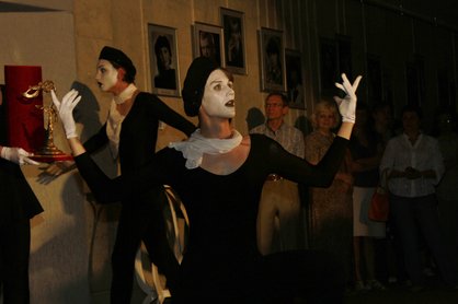 Перед началом спектакля в холле гостей развлекал дуэт – оркестр «ДуЭто's», под музыку которого танцевали и развлекались не только гости, но и мимы – так сказать, хозяева театрального дома, которые «вливали» гостей в общий хоровод и каждому раздавали забавные предсказания. Стоит отметить, что и запуск зрителей в зал на сей раз сопровождался танцевальным номером мимов - они торжественно пронесли росток актерской маски и открыли двери, ведущие в святая святых.