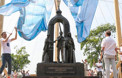 «По правую руку от режиссера изображен литейщик Бориска, который, не зная секрета, по наитию отлил колокол. По левую руку - иконописец, будущий святой Андрей Рублев. На одной из сторон памятника отлита репродукция знаменитой "Троицы" Андрея Рублева», - сообщает «РГ».