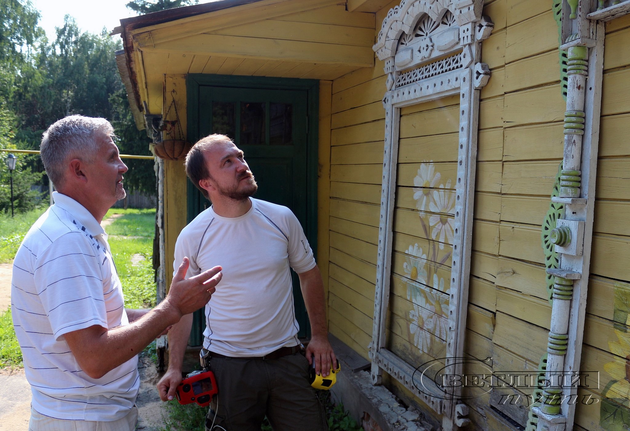 В гостевом доме «Русская дача», как мы сообщали ранее, московский фотограф знакомился с коллекцией наличников, ставших тут элементом дизайна территории (фото газеты "Светлый путь").
