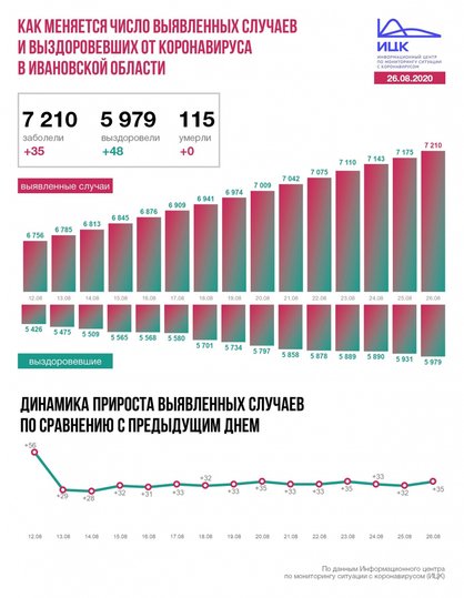 На 26 августа в Ивановской области зарегистрированы 7210 случаев новой коронавирусной инфекции. За сутки подтверждены 35 диагнозов.