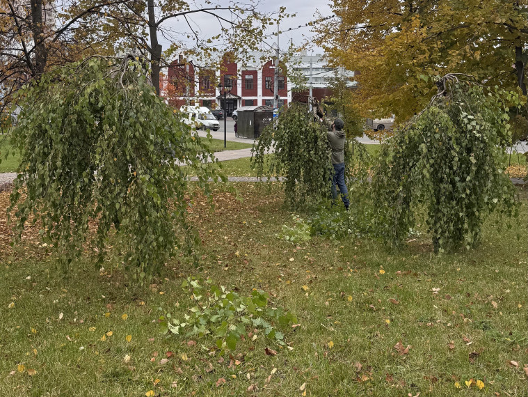 В Троицком сквере особое внимание уделили привитым берёзам плакучей формы. Эти деревья требуют особого ухода, поскольку плакучая форма создается искусственно. Если не удалять прямые побеги, стремящиеся к естественному росту, пендульные ветви начнут усыхать, что приведет к потере декоративности и даже гибели дерева. В рамках работ была проведена обрезка прямых побегов на четырех берёзах. Также в Троицком сквере специалисты фонда срезали "волчки" на трех декоративных яблонях. Волчки – это сильные, вертикальные побеги, которые загущают крону, оттягивают на себя питательные вещества и снижают декоративность и урожайность дерева. Своевременное удаление этих побегов необходимо для поддержания здоровья и эстетического вида деревьев. В сквере Городской дендрологи проведены работы по удалению поросли вяза и клёна ясенелистного в изгороди из кизильника. Неконтролируемый рост этих пород может привести к вытеснению кизильника, формирующего основу живой изгороди. Поэтому так важно сохранить композиционное решение и обеспечить гармоничное развитие растений.