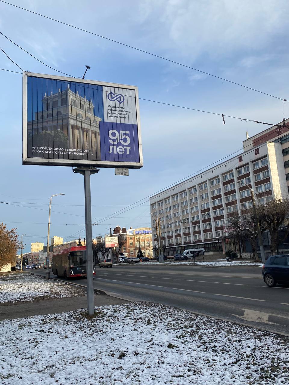 В Иванове на нескольких центральных улицах и у ключевых городских объектов установлены десять баннеров, посвящённых 95‑летию Ивановского государственного медицинского университета. На каждом полотне — строки из гимна вуза.