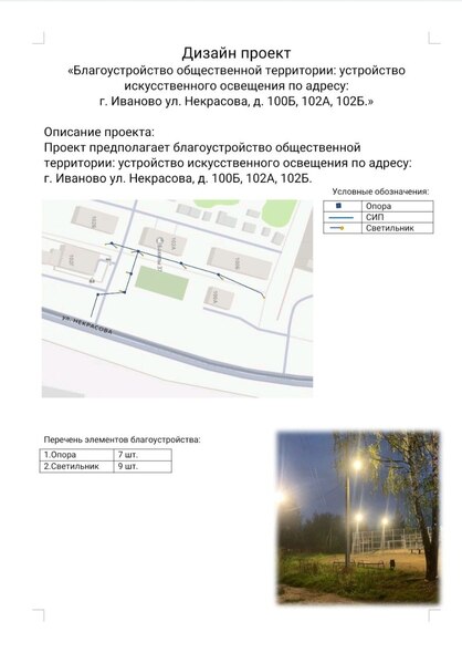 Жители ТОС «Некрасовский» подготовили дизайн-проект по установке уличного освещения. По адресу ул. Некрасова, д.100Б, д. 102А, д. 102Б активисты просят установить 7 опор и 9 светильников.