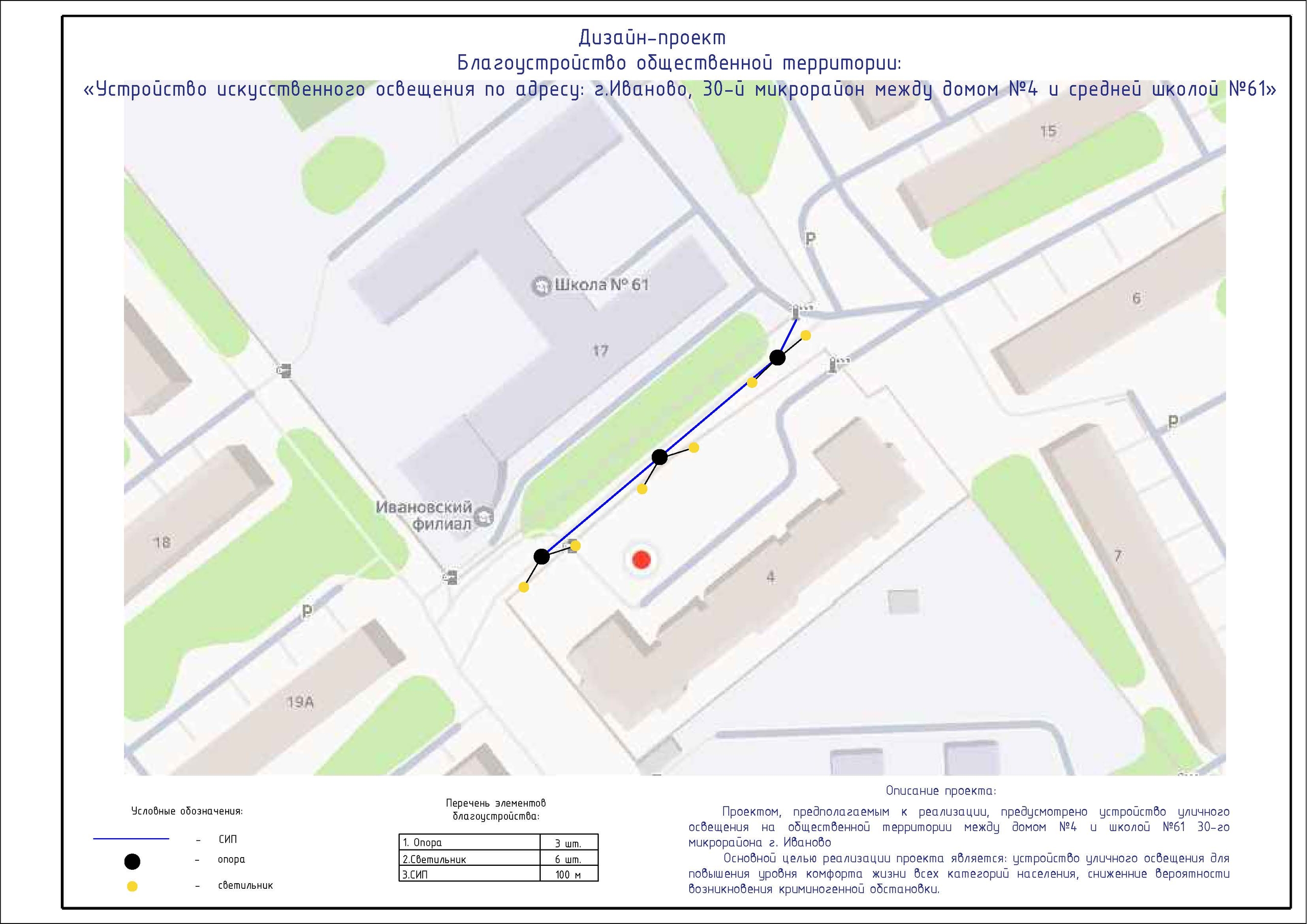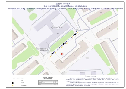Проектом, планируемым к реализации, предусмотрено устройство уличного освещения на общественной территории между домом №4 и школой №61 30-го микрорайона. Для этого планируется установить три опоры, на которых будут закреплены шесть светильников, направленных в разные стороны для максимальной освещенности территории. Жители готовы софинансировать работы и внести свой посильный трудовой вклад в развитие общественной территории.