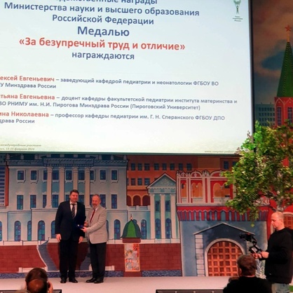 Ученые Ивановского государственного медицинского университета приняли активное участие в XXVII Конгрессе педиатров России с международным участием. На торжественном открытии Конгресса прошло традиционное награждение врачей, ученых, медицинских организаций, которые достигли выдающихся успехов в медицинской и образовательной деятельности. Заведующему кафедрой педиатрии и неонатологии Университета, доктору медицинских наук, доценту Алексею Баклушину была вручена медаль «За безупречный труд и отличие» - ведомственная награда Министерства образования и науки Российской Федерации.