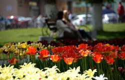 В сквере на площади Революции недавно высадили кусты сортовой сирени, а в клумбах уже распустились тюльпаны.